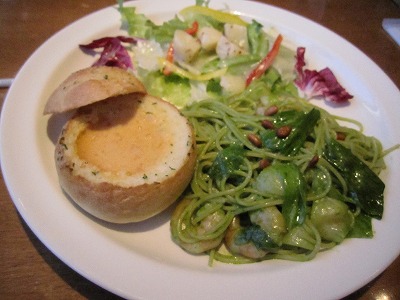 入口です。 インドカリーです。 パンシチューとパスタ盛り合わせプレートです。 マンゴープリンです。 パンシチューの響きが気になってプレートを注文しました。 パンスープとサラダと選べるパスタが付いて、さらにドリンクとデザートも 付いています。 パスタばかり食べるとどうしても後半飽きてしまうので、 パンスープと交互に食べられて満足でした。 ノーマルなパンよりスープが入ってるので見た目も可愛いし 食べ応えもありました。 カレーも本格派でスパイスが効いていました、ビリリ。