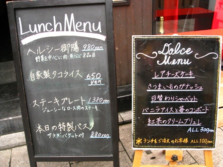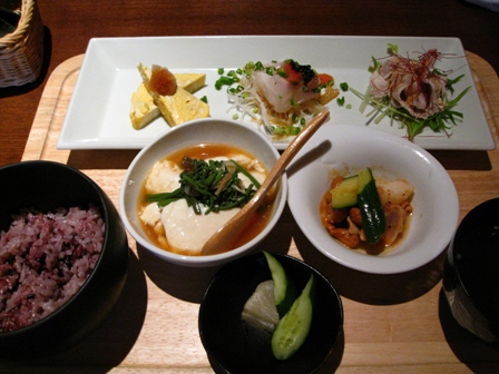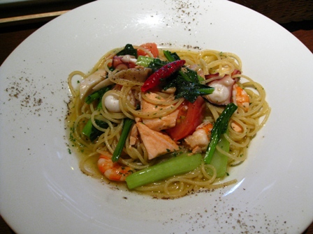 入り口です。ボトルのタワーが冷や汗ものです。 ランチメニューです。 店内です。お昼なのに落ち着いた雰囲気です。 ヘルシー御膳 本日のパスタ、ペペロンチーノ 母はヘルシー御膳、私はパスタランチを注文しました。 約2年ぶりにここのお店に行ったのですが、 その時は、洋風のプレートランチでしたが、バージョンアップして、 和風御膳になっていて、母は喜んでいました。 ペペロンチーノは具だくさんで、サラダもパンも付いていました。 デザートは+100円で頂けるようですが、この時は食べませんでした。 なぜなら・・・・・・・次回に続きます。