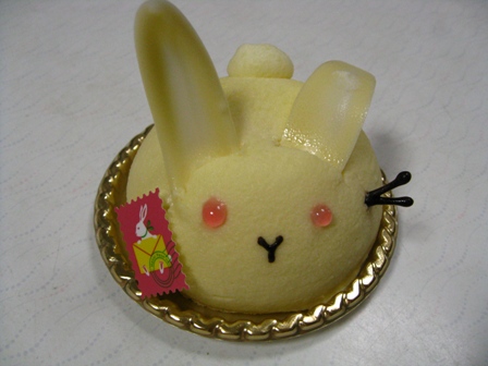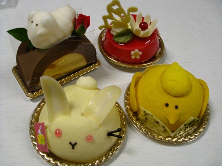 「JUCHHEIM DIE MEISTER」さんのケーキを買って来てくれました。 ひよこケーキです。 うさぎケーキです。 ・・・何か白いのが乗ってるケーキです。 お花のケーキです。 全員集合しました。 全員集合の写メールが送られて来て、楽しみに家路に着いたのですが、 家に帰った頃には上2つのケーキしか残っていませんでした。 が、気を取り直して両方少しずつ頂きました。 ひよこケーキは想像してたのと違って中にオレンジが入っていてさっぱりした味でした。 うさぎのケーキは優しい甘さでパクパク食べられました。 この近辺で取り扱いがあるのは大阪の高島屋か阪神百貨店なので 一度食べ損ねたケーキも食べてみたいです。